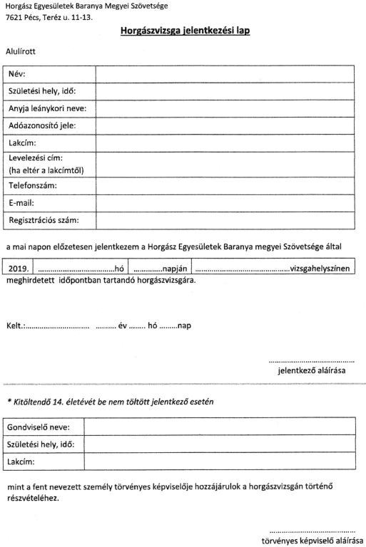 Horgász vizsgára jelentkezési lap
